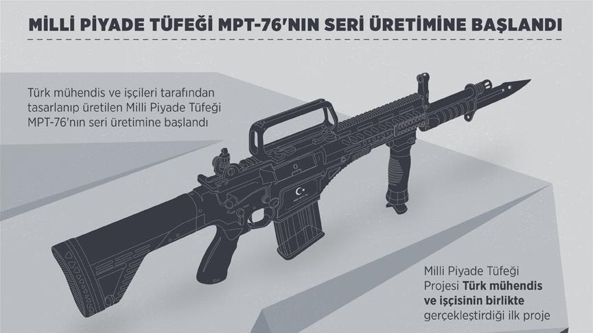 Tamamen yerli imkanlarla geliştirilen Türkiye'nin ilk milli silahı MPT-76'nın seri üretimine de MKEK Kırıkkale Silah Fabrikası'nda başlandı. 4 kilo 180 gram ağırlığındaki silahın etkili menzili 600 metre, dakikadaki atım sayısı 700 mermi ve merminin ilk hızı saniyede 800 metre. Teleskopik dipçiğe sahip silahın, namlu boyu 406 milimetre. Çatal ayağı aynı zamanda el tutamağı vazifesi de görüyor. Üzerindeki pikatini raya, gece görüş dürbünü gibi her türlü cihaz takılabiliyor. Silah aksesuarları ile 413 parçadan oluşuyor.