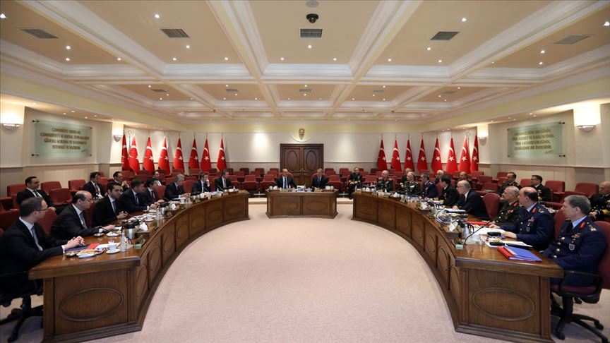 Ege Denizi ve Doğu Akdeniz'deki son gelişmeler ile Suriye'de tesis edilmesi planlanan güvenli bölge başta olmak üzere bölgesel güvenlik ve dış ilişkiler konularının ele alındığı değerlendirme toplantısında, Türkiye'nin hak ve menfaatlerinin korunması konusundaki kararlılık vurgulandı.