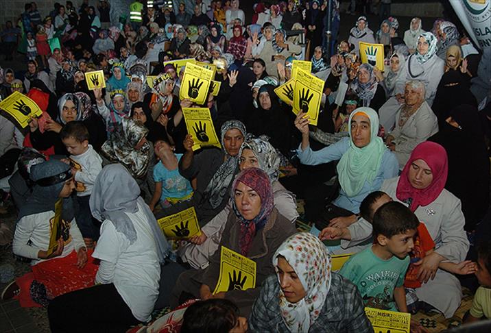 Akşam namazının ardından Ulu Cami Meydanı'nda toplanan platform üyeleri ile çok sayıda vatandaş, "Rabia" işaretleri yapıp, ellerinde Mısır, Suriye ve Filistin halkını destekleyen döviz ve pankartlarla slogan atıp dua etti.