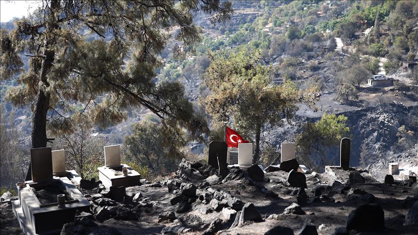 Muğla'nın Menteşe ilçesinde çıkan ve Zeytinköy Mahallesi'nin tamamını etkileyen orman yangınında, mezarlık da zarar gördü.