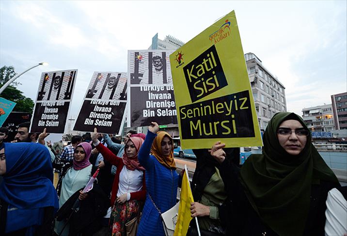 Bebek'teki Mısır'ın İstanbul Başkonsolosluğu önünde toplanan AK Parti İstanbul Gençlik Kolları, Saadet Partisi, Anadolu Gençlik Derneği ve çeşitli sivil toplum kuruluşlarının üyeleri, "Darbeci mahkemeleri tanımıyoruz", "Dünya beşten büyüktür", "Mısır halkı yalnız değildir" yazılı dövizler taşıyarak, sık sık tekbir getirdi.