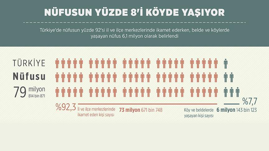 Belde ve köylerde yaşayanların oranı ise toplam nüfusun yüzde 7,7'sini oluşturdu. Geçen yıl bu sayı 6 milyon 143 bin 123 kişi olarak belirlendi.
