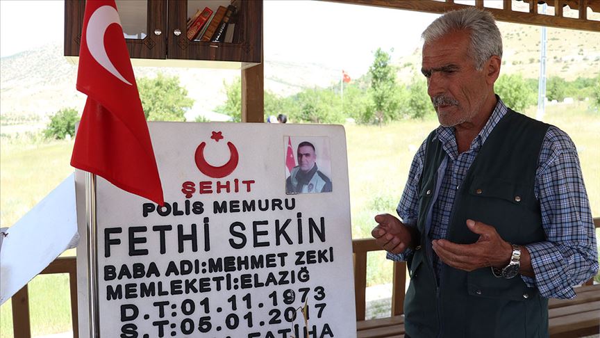 İzmir Adliyesine 5 Ocak 2017'de PKK'lı teröristlerce düzenlenen saldırıyı canı pahasına engelleyen şehit polis memuru Fethi Sekin'in acılı babası Mehmet Zeki Sekin, kahramanlığıyla tüm Türkiye'nin gönlünü fetheden şehit oğlunun Baskil ilçesinin Doğancık köyündeki kabrini ziyaret etti.