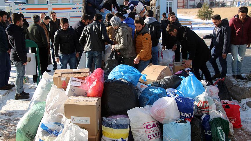 Aşık Veysel Meslek Yüksek Okulu öğrencilerinin harçlıklarıyla aldıkları mama, çocuk bezi ve kıyafetler ile Verenel Derneği'nin katkılarıyla vatandaşlardan toplanan un, battaniye, giyecek ve çocuk bezi el birliğiyle tırlara yüklendi.