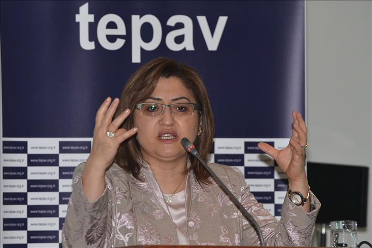 Fatma Şahin, Türkiye Ekonomi Politikaları Araştırma Vakfı'nın (TEPAV) ''Kadın Girişimciliği: Mitler ve Gerçekler'' toplantısından ayrılırken gazetecilerin sorularını yanıtladı.