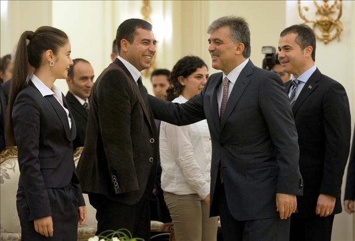 Gençler Gül'e üzerinde ''Uzun ince bir yoldayım/Gidiyorum gündüz gece'' yazan cura ile bedensel engelli Yusuf Akgün'ün, kara kalemi ağzıyla tutarak yaptığı Cumhurbaşkanı Gül'ün resmini hediye etti.