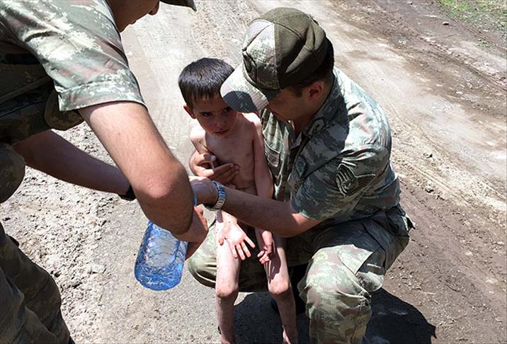Jandarma ekipleri, ağzındaki toprak parçalarını temizledikleri Mustafa Can Yaşar'a su ve yiyecek verdi. AA muhabirleri çocuğun kurtarılma anını görüntüledi.