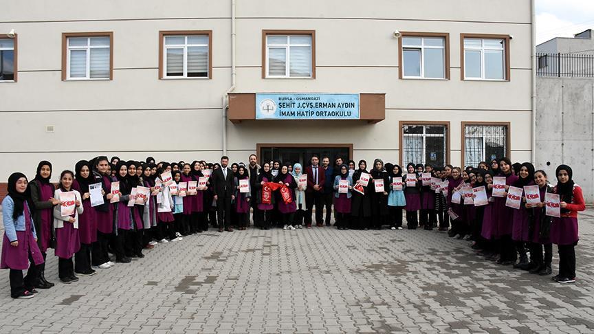 Bursa'daki Şehit Jandarma Çavuş Erman Aydın İmam Hatip Ortaokulu'nda öğrenim gören 100 öğrenci, "Şehitlere Mektup" projesi kapsamında 100 şehit ailesine mektup gönderdi.