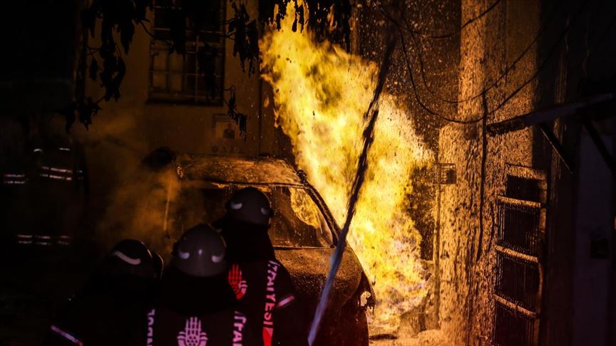 Yangın sonucu otomobilde ve binanın girişinde hasar meydana geldi.
