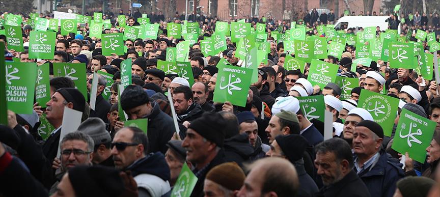 Grup, ellerinde "Anam babam feda olsun", "Peygamberimiz onurumuzdur", "Canımız yoluna feda olsun Ya Resulullah", "Biz Hz. Muhammed'in ümmetiyiz, senin için dünyanın şah damarını keseriz" gibi dövizle ve Türk bayrağı taşıyarak, Cumhuriyet Caddesi'nden Havuzbaşı'ndaki kent meydanına ulaştı.