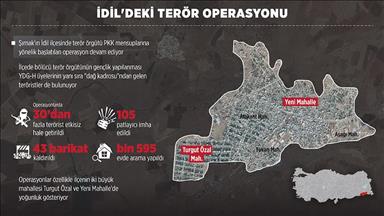 İdil'de PKK'lı teröristlerin yakalanması, patlayıcılarla tuzaklanan çukurların kapatılması, barikatların kaldırılması, halkın can ve mal güvenliğinin sağlanması için 18 Şubat'ta ilan edilen sokağa çıkma yasağının ardından Türk Silahlı Kuvvetleri ve emniyet unsurlarınca başlatılan "Şehit Özel Harekat Polisi Ersin Yıldırım Operasyonu" devam ediyor.