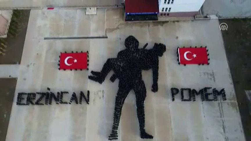 Üniformalı olarak yan yana gelerek kucağında şehit askeri taşıyan bir Mehmetçik'i konu alan Mehmetçik'e Saygı Anıtı'nı sembolize eden polis adayı öğrenciler, koreografi çerçevesinde yine sıraya dizilerek Erzincan POMEM Çanakkale yazısını oluşturdu.