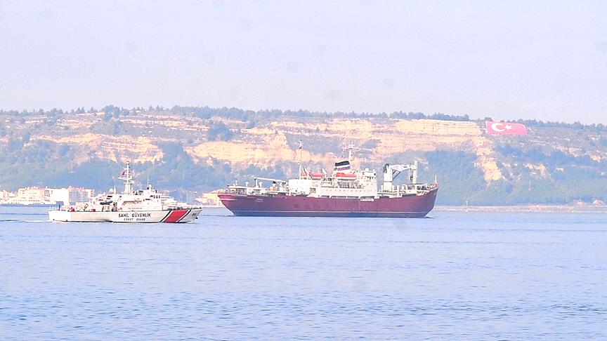 Rus gemisine Çanakkale Boğazı'ndan geçişi sırasında Sahil Güvenlik botları eşlik etti.