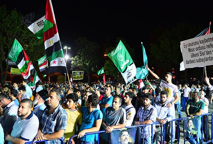 Vatandaşlar, "Dik dur eğilme, Türkiye seninle", "Üzülme, gevşeme, Allah bizimle", "Kahrolsun işbirlikçi zalimler", "İhvan'a selam, direnişe devam", "İslami hareket engellenemez" sloganları attı.