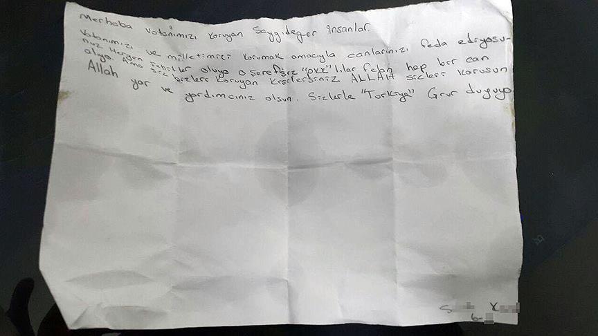 Şehidin üzerinde bulunan 6. sınıf öğrencisi S.K'nın kaleme aldığı mektupta, şu ifadeler yer aldı:
