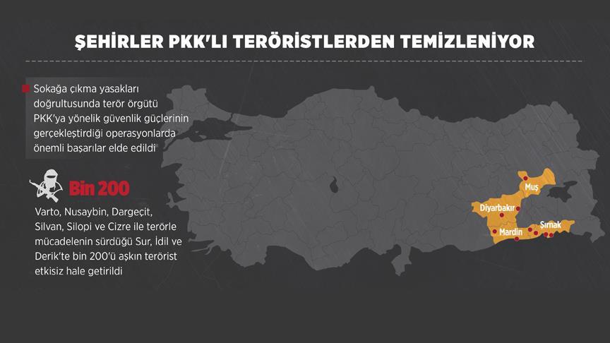Çözüm Süreci'nde silah bırakması beklenirken kırsaldaki saldırılarını şehirlere taşıyan terör örgütü PKK'ya yönelik ilan edilen sokağa çıkma yasakları kapsamında Varto, Nusaybin, Dargeçit ve Silvan ilçelerinin ardından operasyonların tamamlandığı Silopi ve Cizre ile terörle mücadelenin sürdüğü Sur, İdil ve Derik'te bin 200'ü aşkın terörist etkisiz hale getirildi.