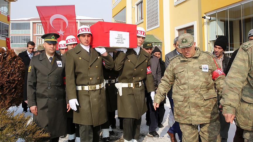 Diyarbakır'ın Sur ilçesindeki operasyonda PKK'lı teröristlerin saldırısı sonucu şehit olan Jandarma Astsubay Tamer Meriç'in cenazesi, memleketi Erzincan'da son yolculuğuna uğurlandı.