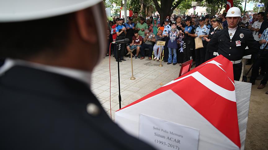 Terör örgütü DEAŞ'a yönelik operasyonda gözaltına alınan şüphelinin, İstanbul Emniyet Müdürlüğünde bıçakla yaralayarak şehit ettiği polis memuru Sinan Acar, memleketi Bursa'da son yolculuğuna uğurlandı.