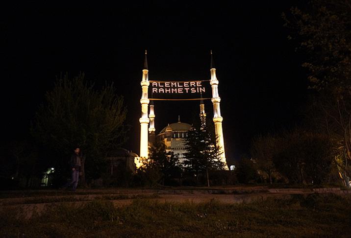 Vakıflar Edirne Bölge Müdürü Osman Güneren, bir haftadır çalışan Vakıflar Genel Müdürlüğü mahya ekibinin hazırlanan mahyayı Selimiye Camisi'nin minarelerine astığını söyledi.