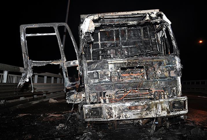Güvenlik güçleri, kamyonun tamamen kullanılamaz hale geldiği yangının ardından kaçan teröristlerin yakalanması için bölgede geniş çaplı operasyon başlattı.