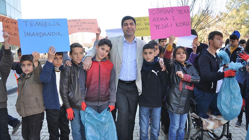 Siirt'te çocuklar, İçişleri Bakanlığınca görevlendirme yapılan belediyenin temizlik hizmetine destek olmak için hazırladıkları afişlerle kentte yürüyüş yapıp çöp topladı.