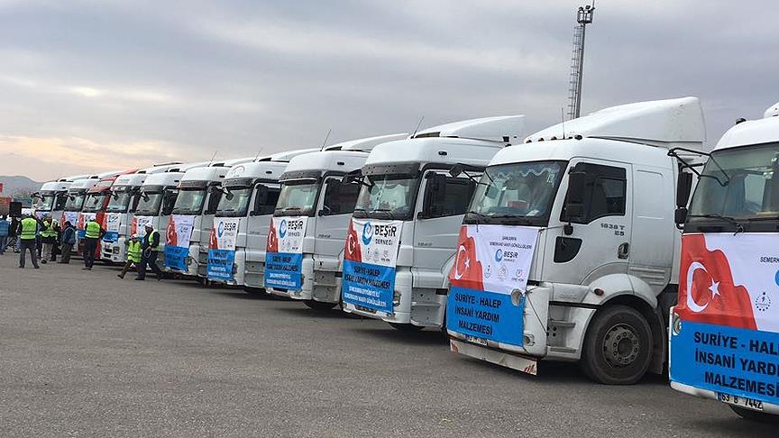 Beşir Derneği Şanlıurfa Şubesi öncülüğünde, sivil toplum kuruluşlarının desteğiyle "Halep İçin Elini Uzat" kampanyasında temin edilen un, su, kuru gıda, elbise, çocuk maması ve battaniyeler, gönüllü vatandaşlar tarafından 11 tıra yüklendi.