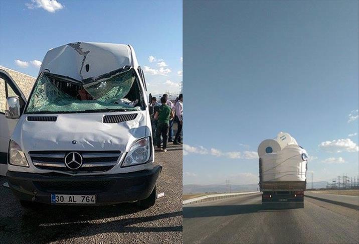 Başkale ilçesinde, kamyonun kasasından düşen su deposunun çarptığı minibüsteki 2 kişi ağır yaralandı.