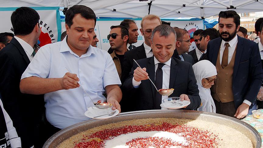 Sur Belediyesi ve Kaymakamlık tarafından muharrem ayı dolayısıyla Ulu Cami önünde düzenlenen etkinlikte, hazırlanan aşure Özkan ve Kaymakam Memduh Tura tarafından vatandaşlara dağıtıldı.