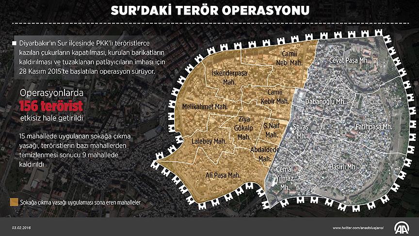 Cevatpaşa, Fatihpaşa, Dabanoğlu, Hasırlı, Cemal Yılmaz ve Savaş mahallelerinde yoğun şekilde devam eden operasyonlarda bugüne kadar 156 terörist etkisiz hale getirildi, çok sayıda çukur kapatıldı, barikat kaldırıldı ve sokaklara döşenen patlayıcılar imha edildi.