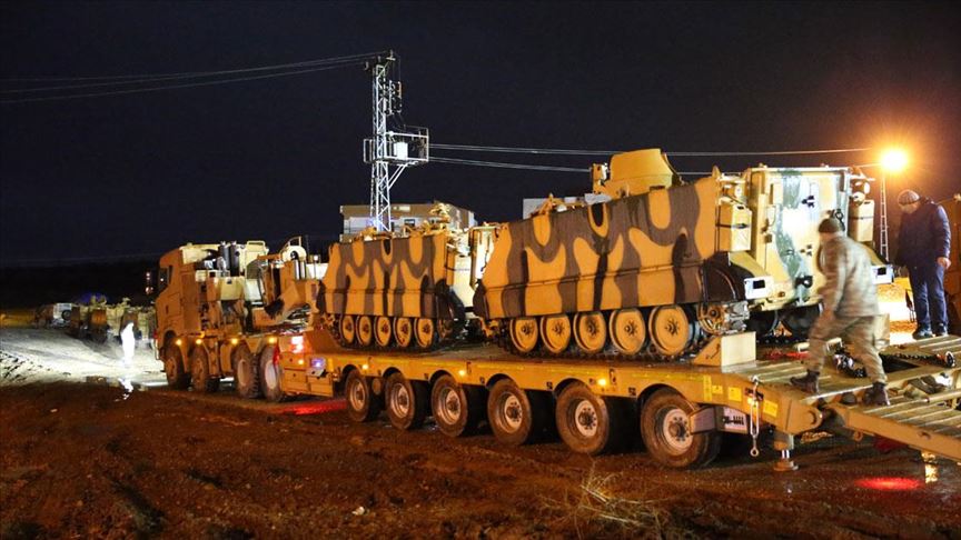 Türk Silahlı Kuvvetleri tarafından İdlib'deki gözlem noktalarına paletli zırhlı personel taşıyıcı (ZPT) takviyesi yapıldı. Burada askeri personel tarafından tırlardan indirilen ZPT'ler, güvenlik önlemi altında İdlib'deki gözlem noktalarına yönlendirildi. ( Cem Genco - Anadolu Ajansı )