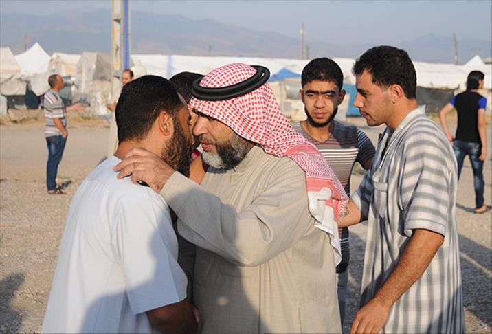 Hatay'ın Altınözü ilçesindeki Boynuyoğun Konaklama Tesisi'nde kalan Suriyeliler bayram namazlarını çadırkentte bulunan camide kıldıktan sonra ülkelerindeki olayların sona ermesi için dua etti.