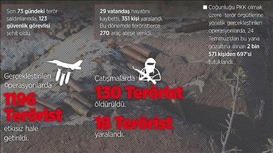 “Hiç endişeniz olmasın askerimiz, polisimiz, istihbarat birimlerimiz son derece başarılı biçimde onlarla gereken mücadeleyi veriyorlar” diyen Cumhurbaşkanı Erdoğan, Bingöl’de 2 polisi şehit eden “alçakların” başarılı bir operasyonla ölü olarak ele geçirildiğini, Türk bayrağını ateşe veren “hainlerin” yakalandığını, şehirlerdeki başarılı operasyonlarla zanlıların tek tek toplandığını söyledi.
