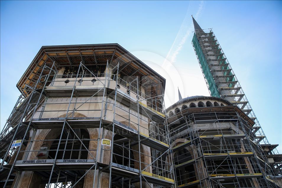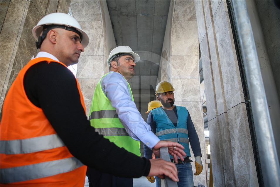 Kaba inşaatı tamamlanan camide mermer kaplama ve çelik işçilik çalışmaları sürüyor, 61 metre yüksekliğindeki 2 minarenin taş kaplaması yapılması için de iskele kuruldu.