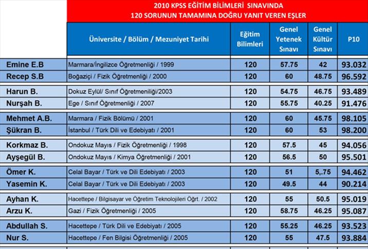 Raporda, "eğitim bilimleri alanında 100-120 arası ve genel yetenek ile genel kültürde 58-60 arası ham puan alanlardan 31'inin 2006-2007-2008 ve 2009 yıllarında 70 ve altında, 66'sının ise 35 ve altında ham puan aldıkları"na dikkat çekilirken, 2010'daki sınavda bu adayların, ortalama iki kat fazla ham puan aldıkları kaydedildi.