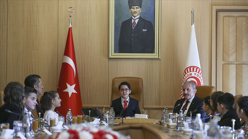 TBMM Başkanı Mustafa Şentop, 23 Nisan Ulusal Egemenlik ve Çocuk Bayramı kutlamaları kapsamında Milli Eğitim Bakanı Ziya Selçuk ve beraberinde çeşitli okullardan gelen öğrenci ve öğretmenleri Meclis Divan Salonu'nda kabul etti.