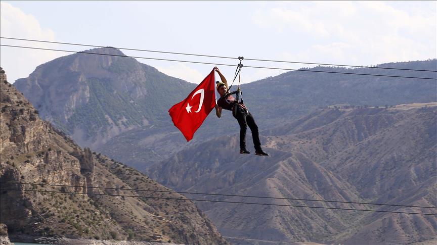 Karadenizli Halil İbrahim Bingöl, Erzurum'un Uzundere ilçesinde doğal güzellikleriyle ünlü Tortum Gölü'nün üzerine, kendi imkanlarıyla zipline kurdu.