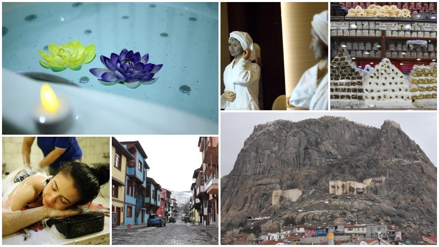 Termal turizm için Afyonkarahisar'a gelen misafirler, kentin simgesi "Afyon Kalesi" ve eteğindeki tarihi konakları da ziyaret ediyor.
