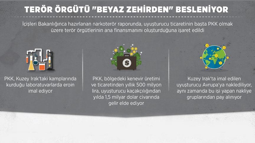 İçişleri Bakanlığınca hazırlanan narkoterör raporunda, uyuşturucu ticaretinin başta PKK olmak üzere terör örgütlerinin ana finansmanını oluşturduğuna işaret edilerek, buna yönelik mücadeleye ilişkin detaylara yer verildi.