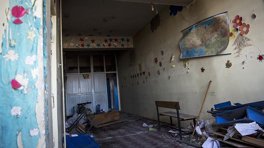 Teröristlerce masa ve sıraların yakılıp büyük zarar verilen okulda, öğrenciler tarafından çizilen ve sınıflardaki panolara asılan resimlerde bile mermi izleri bulunuyor.