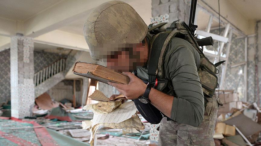 Camideki çok sayıda Kur'an-ı Kerim'in teröristlerce parçalandığı, bir kısmının yakıldığı ve yere saçıldığı görüldü. Bölgede güvenliği sağlayan askerler, Kur'an- Kerim sayfalarını topladıktan sonra öperek yüksek bir yere koydu.