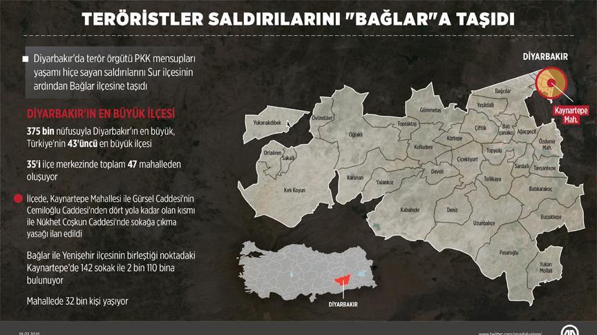Sur'da büyük kayıp veren teröristler, yaşamı hiçe sayan saldırılarını bu kez Bağlar'ın Kaynartepe Mahallesi'ne taşıdı. Önceki gece mahallede yolu trafiğe kapatıp bazı araçları ateşe veren, ara sokaklara barikat kurup, çukur kazmaya çalışan teröristlerin güvenlik güçlerine uzun namlulu silahlarla saldırması sonucu çıkan çatışmada bir polis memuru şehit oldu, 10 polis yaralandı, 3 terörist etkisiz hale getirildi.