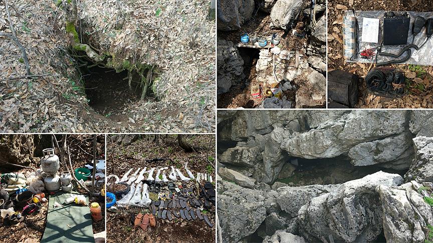 "Sığınaklar, ağaçlık, çalılık ve kovuğu ile toprağa gömülü bidonlar içerisinde, RPG-7 roketatar, Bixi makineli piyade tüfeği, M-16 piyade tüfeği, 10 AK-47 kalaşnikof piyade tüfeği, 3 G-3 piyade tüfeği, HK-33 piyade tüfeği, mavzer tüfeği, 4 tabanca, 8 el bombası, 3 RPG-7 anti-tank mühimmatı, 2 RPG-7 anti-personel mühimmatı, 5 roketatar sevk fişeği, 3 bin 245 muhtelif fişek, 33 şarjör, elektrikli fünye, uzaktan komutalı mayın/el yapımı patlayıcı düzeneği, mayın/el yapımı patlayıcı düzeneği hazırlamakta kullanılan çok sayıda elektronik devre, 2 tabanca susturucusu, araç telsizi, el telsizi, ses kayıt cihazı, 4 el dürbünü, 18 takım terörist kıyafeti, 3 takım gizleme özellikli terörist kıyafeti, 2 terörist gizleme ağı, 130 kilogram amonyum nitrat, 12,5 litre mazot, 13 pil bloku, 264 pil, 275 metre elektrik kablosu, 3 sırt çantası, 51 tüp, küçük tip jeneratör, digital fotoğraf makinesi, rüzgar ölçer cihazı, makinalı tüfek çatal ayağı, şemsiye, biri 1 ton ikisi 500 litre kapasiteli olmak üzere toplam 3 su tankı, 190 kilogram un, 159 kilogram şeker, 130 kilogram bulgur, 121 kilogram kuru fasulye, 99 litre yağ, 82 kilogram zeytin, 77 kilogram peynir, 75 kilogram pirinç, 64 kilogram salça, 55 kilogram makarna, 50 kilogram nohut, 48 kilogram çay, 37 kilogram mercimek, 26 kilogram tuz, 25 kilogram kurutulmuş nane, 14 kilogram helva, 12 kilogram reçel, 10 kilogram kuru kahve, 5 kilogram pekmez, 12 lavaş ekmek, çok sayıda örgütsel kitap, doküman, yaşam ve giyim malzemesi."