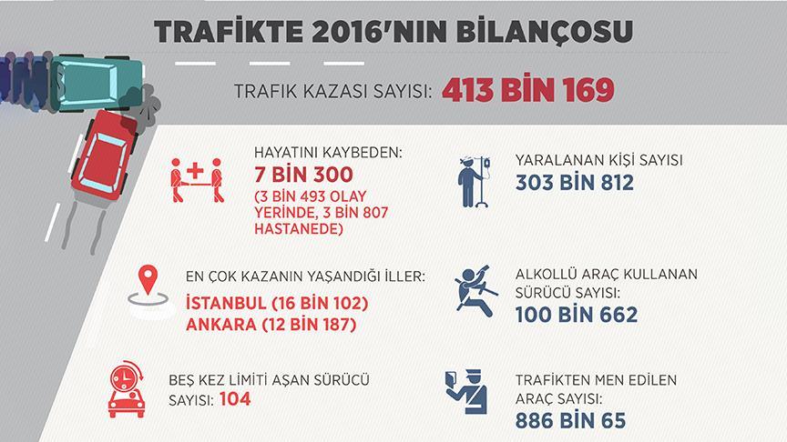 AA muhabirinin emniyet yetkililerinden aldığı bilgiye göre, 2016'da 325 bin 715'i yerleşim yerlerinde, 87 bin 452'si bu yerlerin dışında olmak üzere 413 bin 167 trafik kazası meydana geldi.