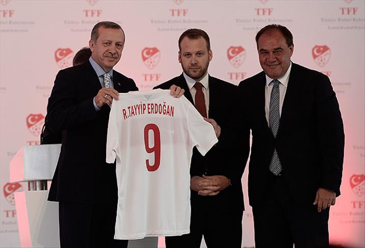 Türkiye Futbol Federasyonu (TFF) Başkanı Yıldırım Demörören, Başbakan Erdoğan'a üzerinde "Recep Tayyip Erdoğan" yazılı 9 numaralı milli takım forması hediye etti.