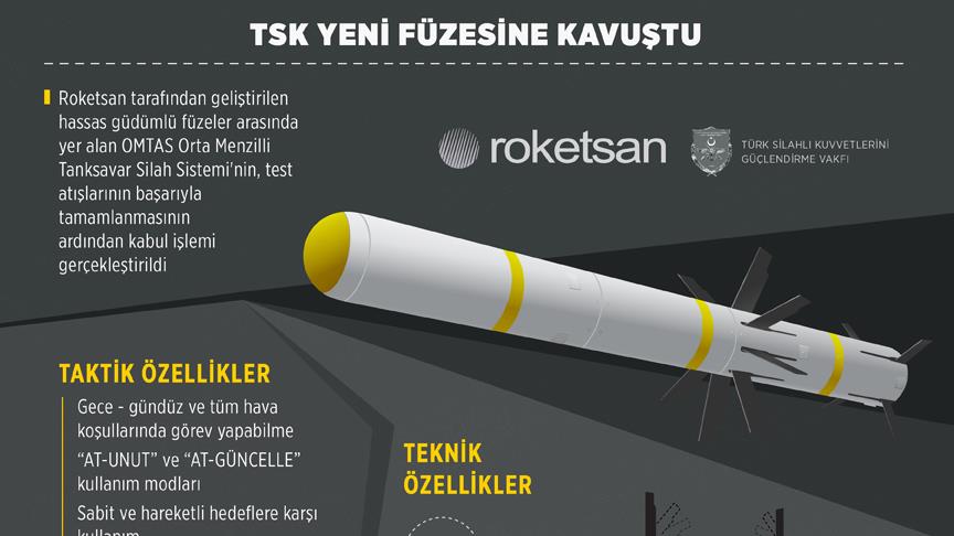 Türk Silahlı Kuvvetleri (TSK), OMTAS Fırlatma Sistemi ile 8 OMTAS tanksavar füzesinin kabul işlemlerini tamamladı, yerli üretim silahlar bu ay içinde Kara Kuvvetleri Komutanlığınca kullanılmaya başlanacak.