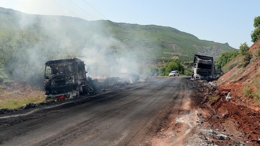 Daha sonra durdurdukları araçların geçişine izin veren teröristler, malzeme yüklü 2 tırı da ateşe vererek, bölgeden kaçtı.