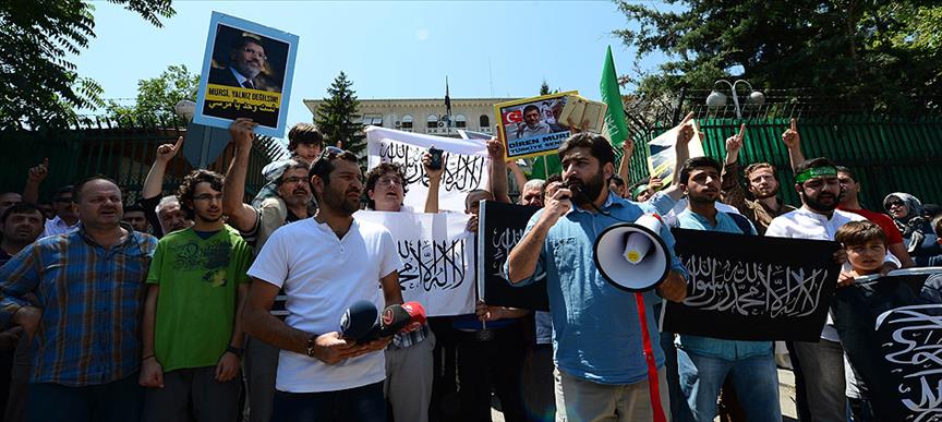Ankara Gençlik Platformu üyeleri, öğle namazından sonra Mısır’ın Ankara Büyükelçiliği önünde toplandı. Yaklaşık 100 kişiden oluşan grup, üzerinde "Mursi yalnız değilsin", "Diren Mursi, Türkiye Seninle", "Mısır’daki katliamları durdurun" yazan pankartlar açtı.