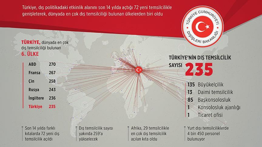 Türkiye, dış politikadaki etkinlik alanını son 14 yılda açtığı 72 yeni temsilcilikle genişleterek 2016'da 235'e ulaşan temsilcilik sayısıyla dünyada en çok dış temsilciliği bulunan 6'ncı ülke oldu.