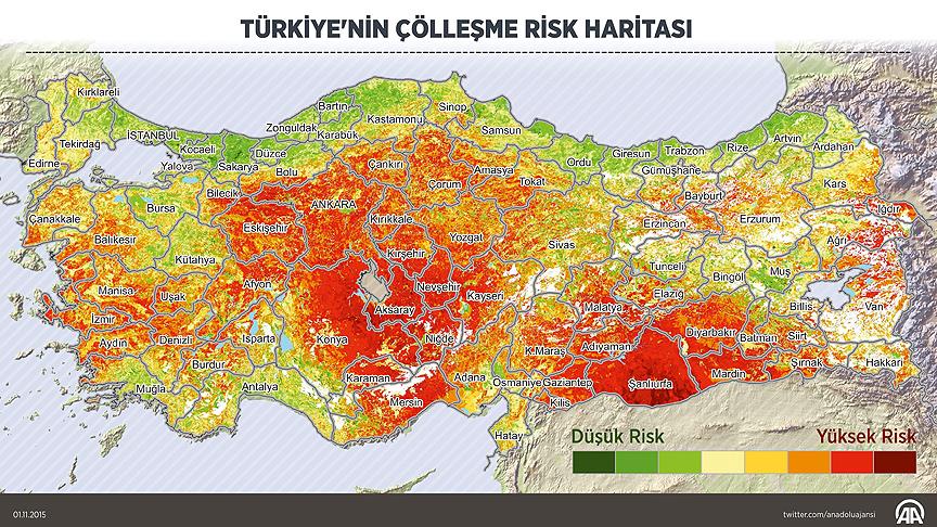 Orman ve Su İşleri Bakanlığı Çölleşmeve Erozyonla Mücadele (ÇEM) Genel Müdürlüğü ve TÜBİTAK-BİLGEM tarafından gerçekleştirilen proje kapsamında oluşturulan "TürkiyeÇölleşme Risk Haritası"na göre, Türkiye'nin yaklaşık yüzde 47'sinin orta ve üzeri çok yüksek risk grubunda yer aldığı bildirildi.
