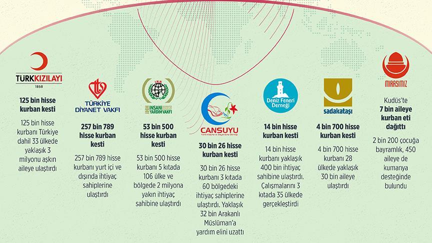 Dernek aracılığıyla bağışların 3 kıtada 60 bölgedeki ihtiyaç sahiplerine ulaştırılması sağlanırken, bir süre önce sel felaketinin yaşandığı Sierra Leone'de bin 400, DEAŞ'ın düzenlediği saldırılara maruz kalan Moro'da bin 50 hisse kurban kesildi, ayrıca bütün ülkelerde çocuklara bayram harçlığı ve hediyeler de verildi.